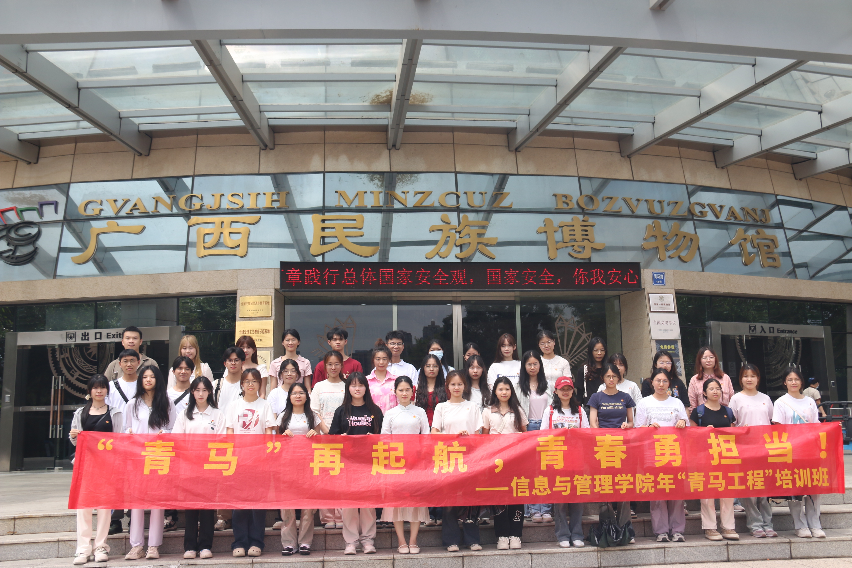 “青马”学员首先前往广西壮族自治区展览馆。学员们跟随红领巾讲解员的步伐先后参观了“烽火南疆”“巨变壮乡”“潮涌八桂”“壮美广西”四大展厅。在参观过程中,学员们认真聆听讲解,不时驻足观看一系列生动的场景模型、珍贵的历史图片和档案资料,进一步了解了广西这片土地上发生过的英雄事迹、感人故事和伟大成就。
