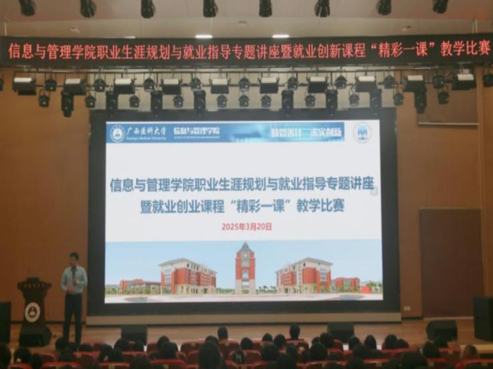 2025年3月20日,beats365亚洲版在武鸣校区图书馆报告厅举办职业生涯规划与就业指导专题讲座暨就业创业课程“精彩一课”教学比赛。学院党委书记闵晓阳、党委副书记蒋鹏、副院长张新花、学工办主任何锡嘉、学院辅导员以及2022级全体学生参加本次活动。